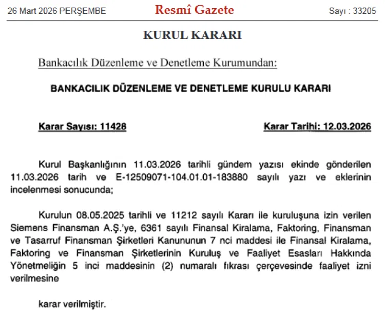 ANKARA (İGFA) - Bankacılık Düzenleme ve Denetleme Kurulu’nun 12 Mart 2026 tarihli ve 11428 sayılı kararıyla, Siemens Finansman AŞ’ye faaliyet izni verildi. Söz konusu karar, bugünkü Resmî Gazete’de yayımlanarak yürürlüğe girdi.